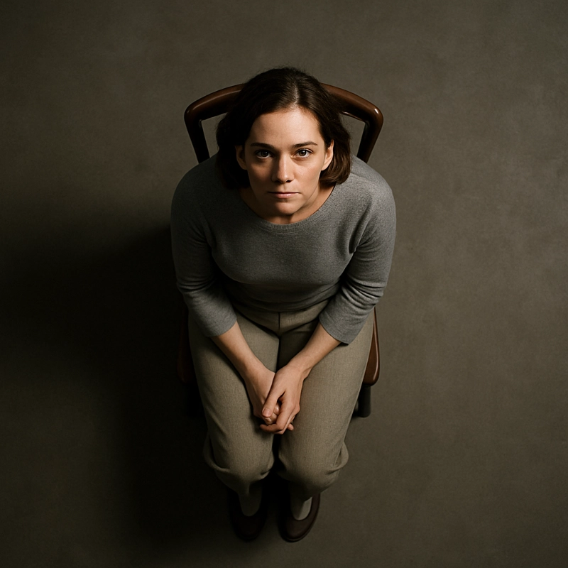 Seen from above, a light-skinned woman sits on a simple wooden chair, her medium-length wavy brown hair parted to the left. With her neutral gaze directed upward, she wears a loose gray sweater and beige pants, seated with clasped hands on the stark, textured concrete floor—creating a serene, minimalist scene highlighted by soft lighting and muted tones.