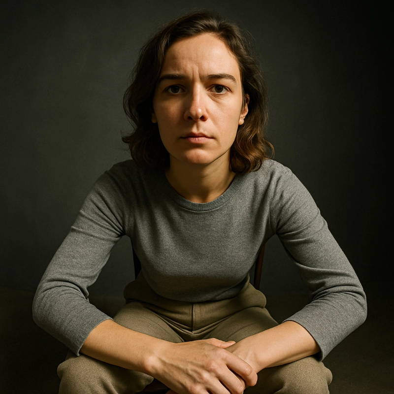 In this striking image, a woman with wavy brown hair, sitting on a wooden chair, stares directly into the camera with an intense gaze. The composition places her face as the focal point, illuminated by soft, even lighting, while her textured gray sweater and beige trousers stand in contrast to the dark gray backdrop.