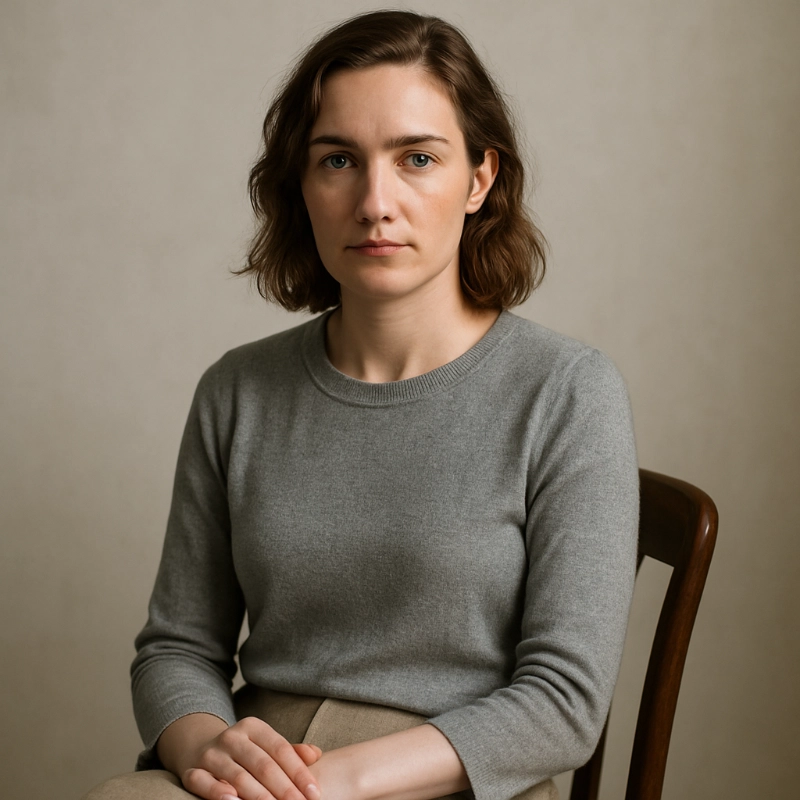 A medium format studio photograph of a woman seated on a wooden chair against a soft neutral backdrop. She has light skin and wavy brown hair, wearing a simple gray sweater and beige pants. Captured with ultra sharp details and natural soft lighting, emphasizing texture, skin detail, and clarity. The image is highly resolved and crisp, composed in a clean 1:1 frame with minimal depth of field and no filters.