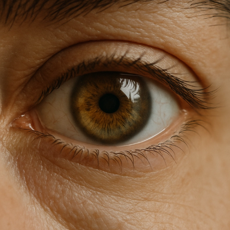 Extreme close-up of a woman's eye, shot with a 100mm macro lens. Sharp detail in the iris and eyelashes, soft diffused lighting, 1:1 aspect ratio, cinematic texture.